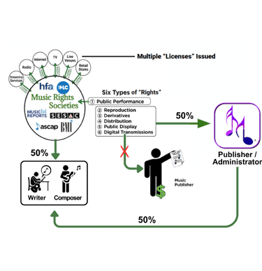 When you create a song, you automatically becoming both the Songwriter (owning the rights), and the Publisher (Controlling or licensing the rights). By default you own and control at least 6 different copyrights to your song. These rights allow you to license your song to businesses or paid sources for a specific use and collect license fees wherever your song is used. Controlling the rights also allows you to register ownership or administer your song rights with music societies/rights organizations collecting royalties generated wherever your song is streamed, performed, played, or otherwise used.